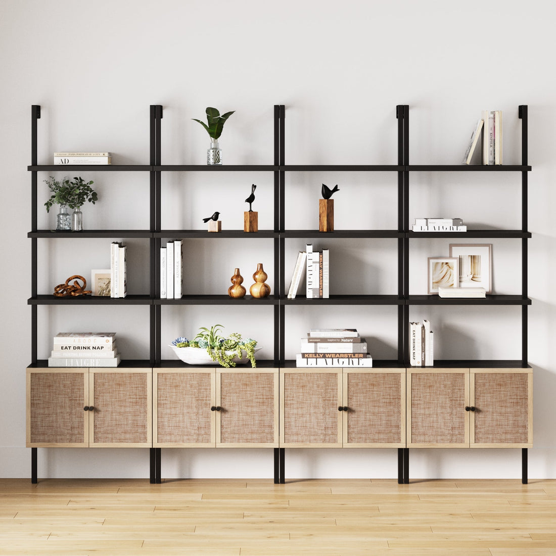 Rattan Ladder Wall Bookshelves with Doors Black (Set of 4)