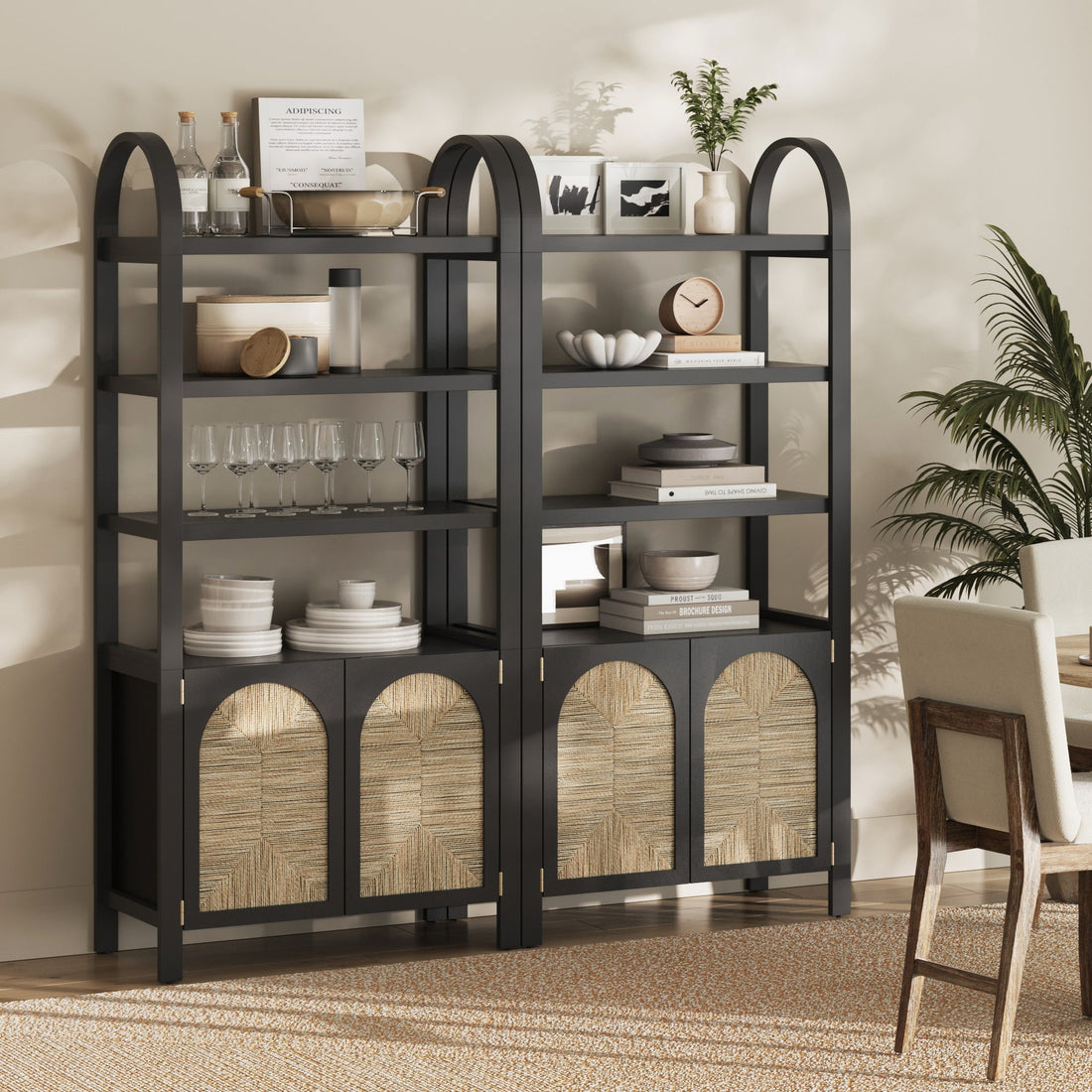 Boho Seagrass Arched Bookshelf Black (Set of 2)