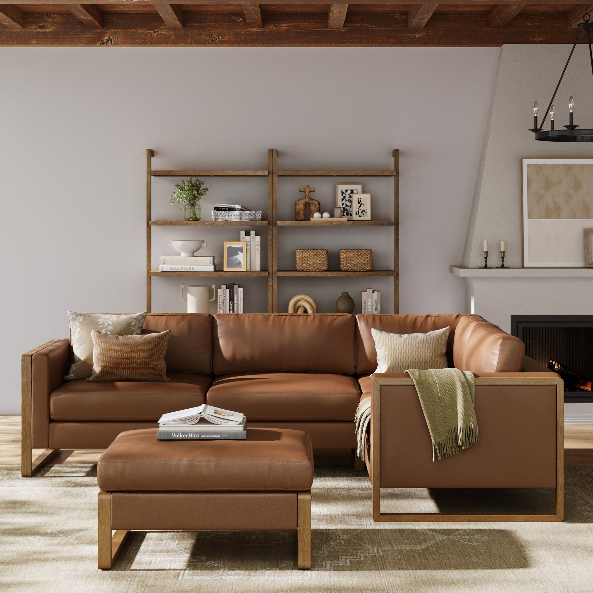 Leather 4-Seat Wood Frame Sectional Couch & Storage Ottoman Camel