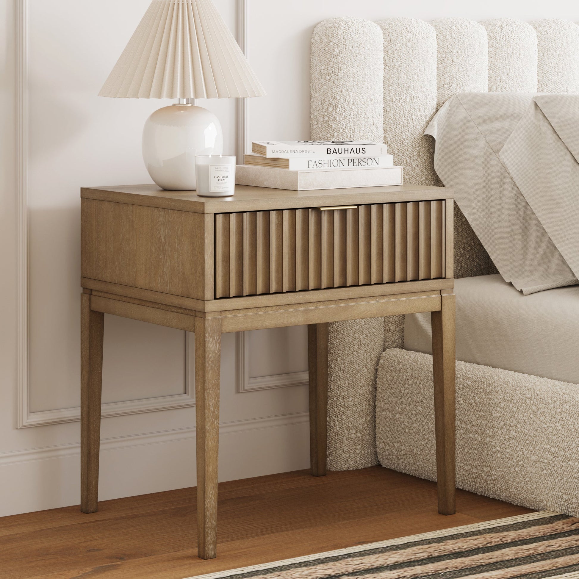 The perfect place for your bedside essentials. Meet Jasper! Jasper features a fluted drawer front in a light brown finish and tapered legs that balance the sleek profile. This bohemian-inspired nightstand effortlessly blends beauty with functionality. The front drawer boasts a simple and stunning brass color handle that opens to reveal deep storage to help keep your items organized. Use it in the living room, entryway or bedroom—this nightstand is as versatile as it is stylish.