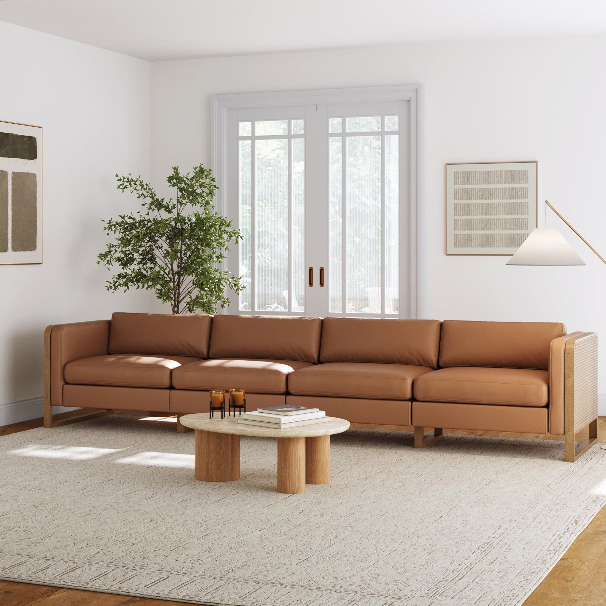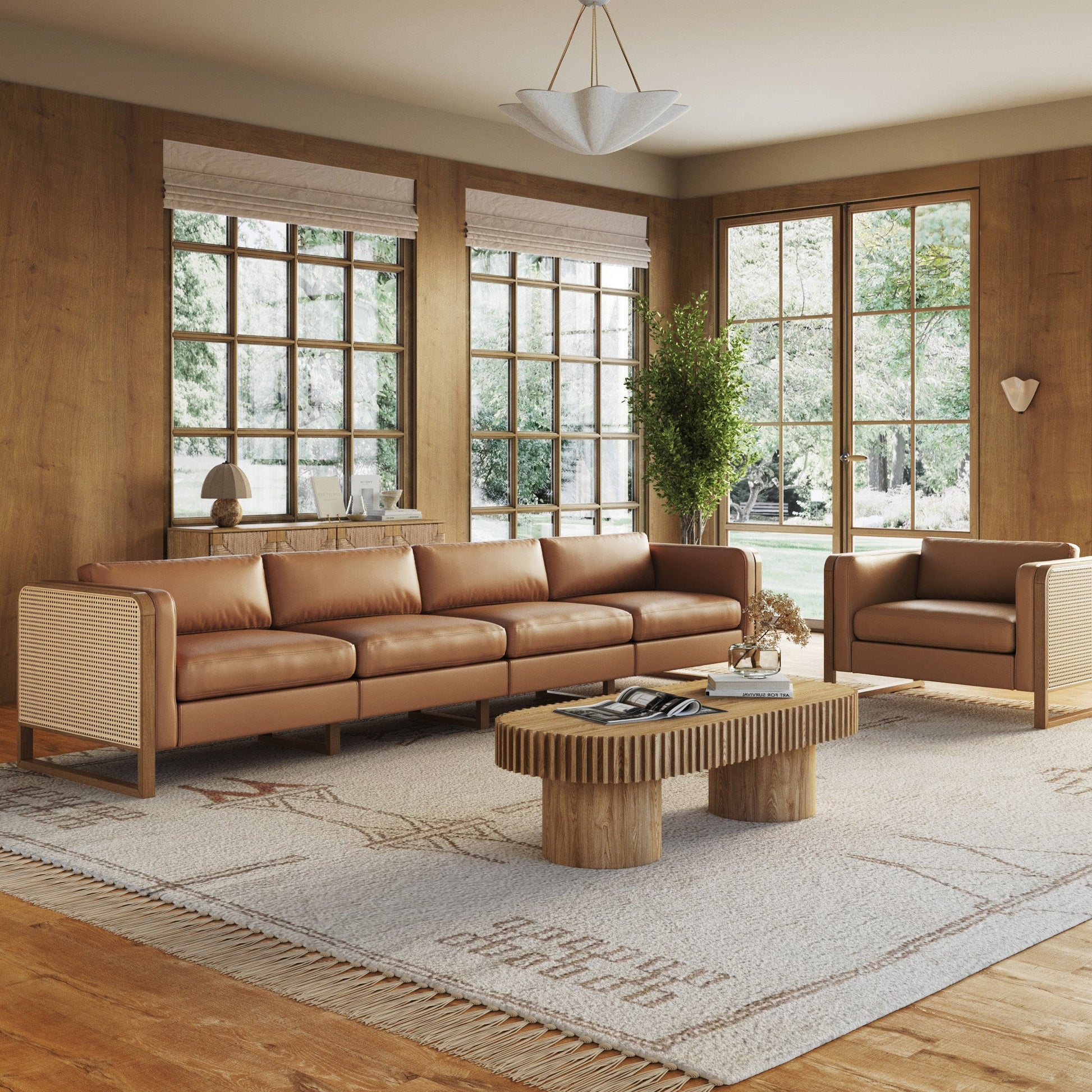 Boho 4-Seater Sofa Solid Wood Legs & Rattan Arm Camel