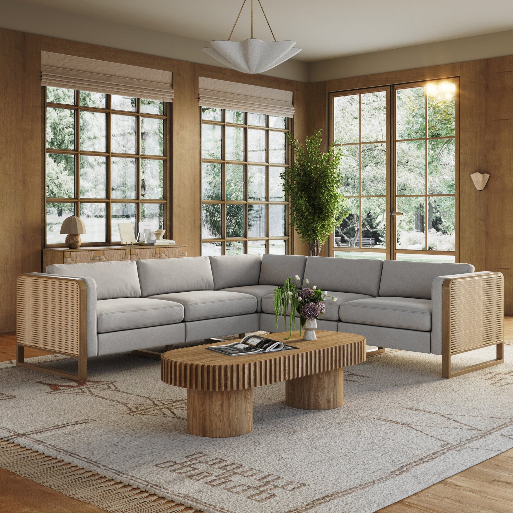 Boho 5-Seat Sectional with Wood Frame & Rattan Arm Gray