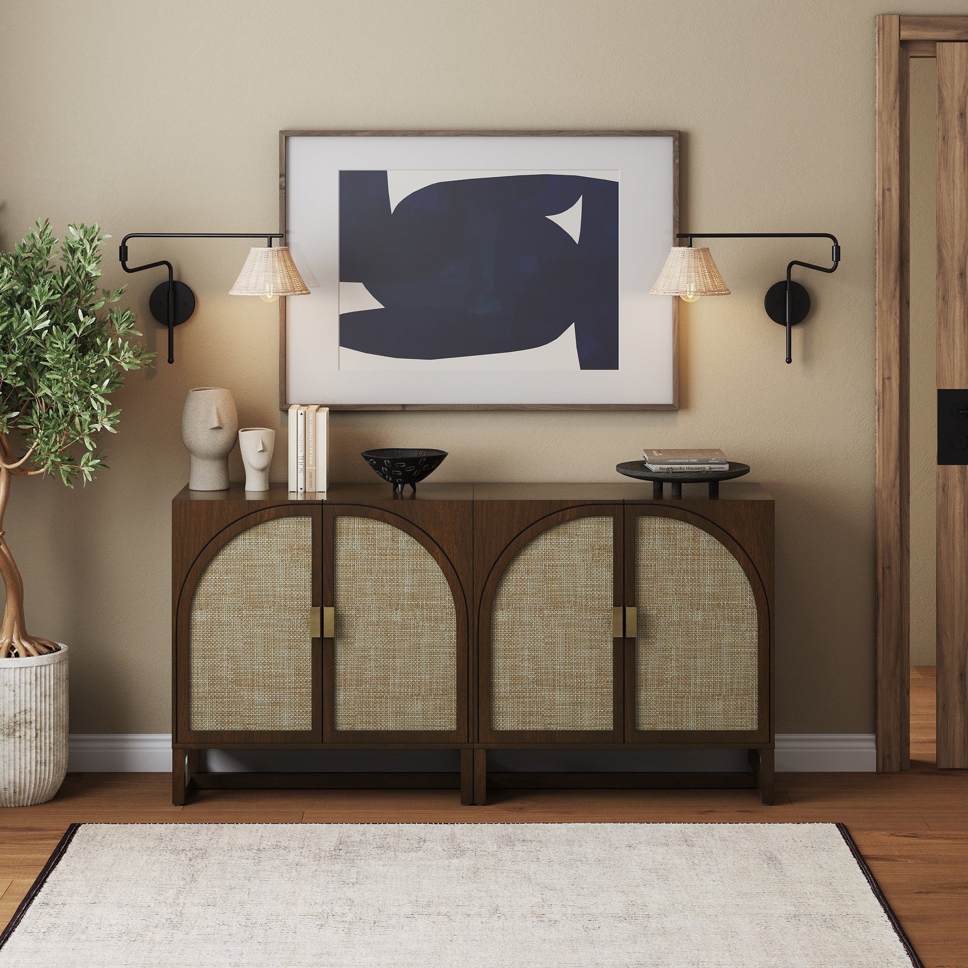 Meet the Paxton console table. Its standout feature lies in its striking arch door design details, which adds a touch of architectural elegance to any space. But what truly sets Paxton apart is its durable faux rattan-paneled cabinet doors that add a touch of warmth to its sleek design. Inside, you'll find closed storage with an adjustable shelf, providing ample space to organize and declutter your living area. This quality wood veneer unit sits on a solid wood base leg construction with leveling floor protectors to keep it sturdy for years to come.