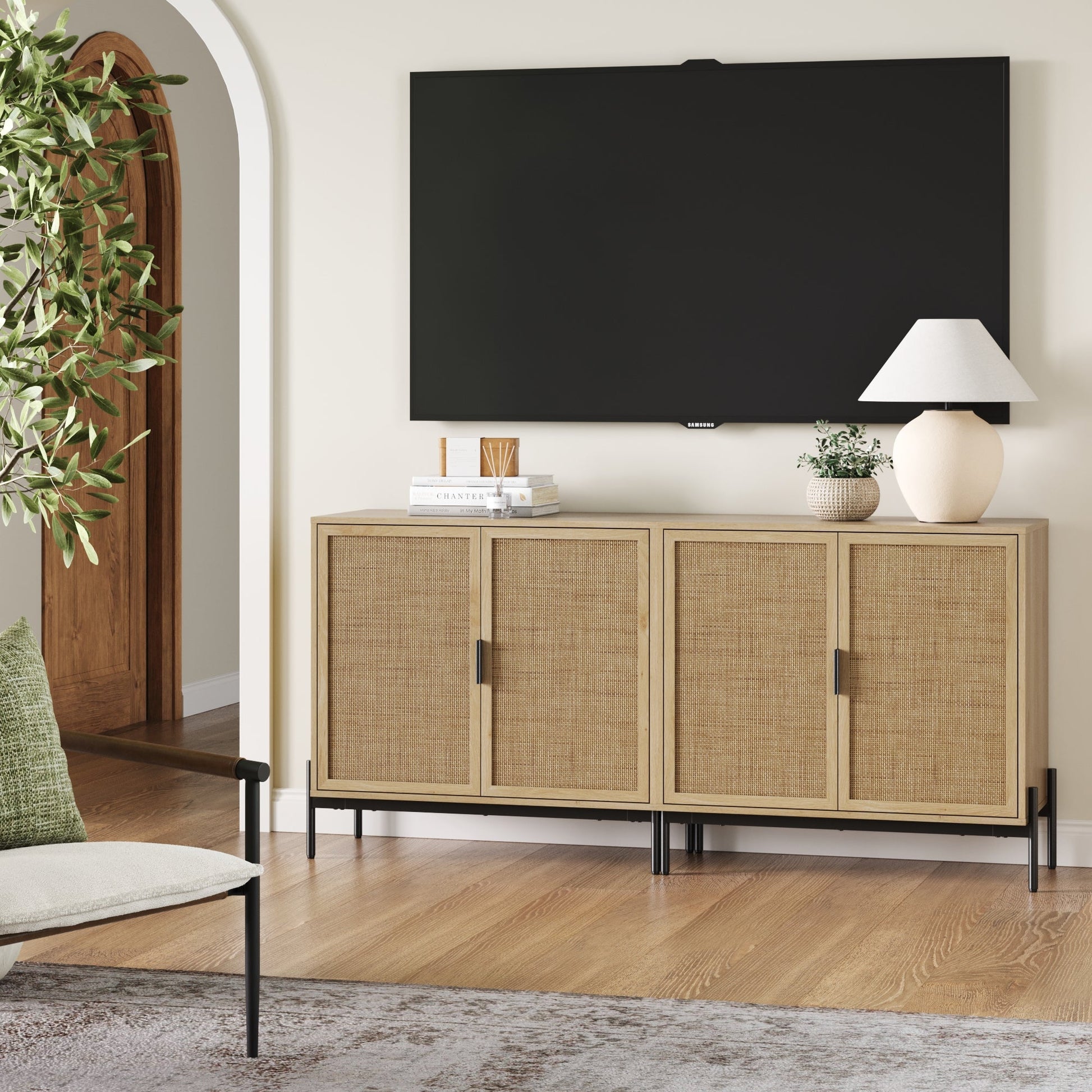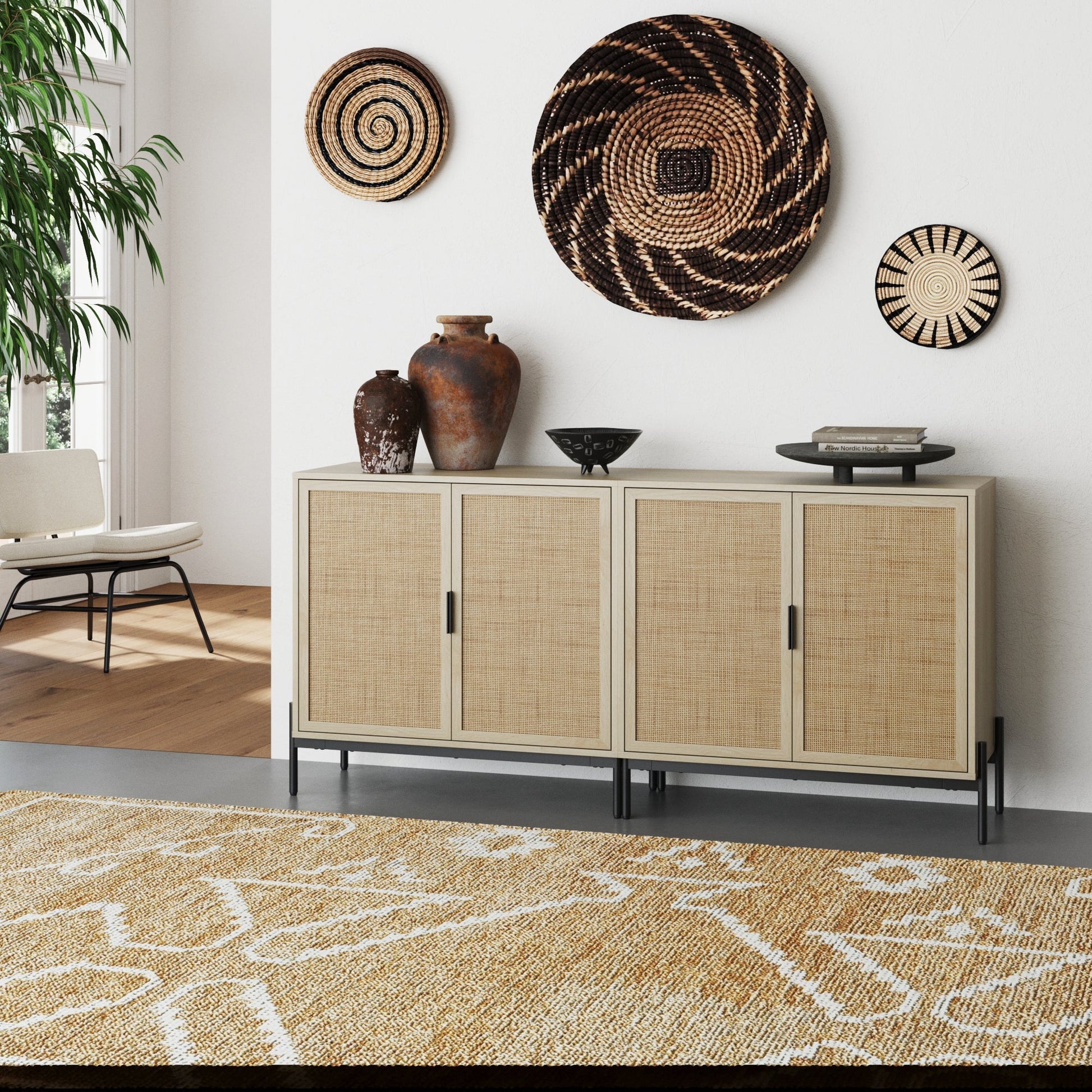 Meet the Andrew Storage Cabinet, where boho vibes blend perfectly with modern touches. It's built with a sturdy sleek metal base and has unique rattan doors that bring a warm, natural look – no two are exactly alike! Designed with versatility in mind, the cabinet features interchangeable legs, enabling a seamless setup alongside other units for a perfectly flush, cohesive look. This cabinet's not just about storage; it's a fun way to add some personality to your space. It's practical, stylish, and brings bohemian, laid-back feel to any room!