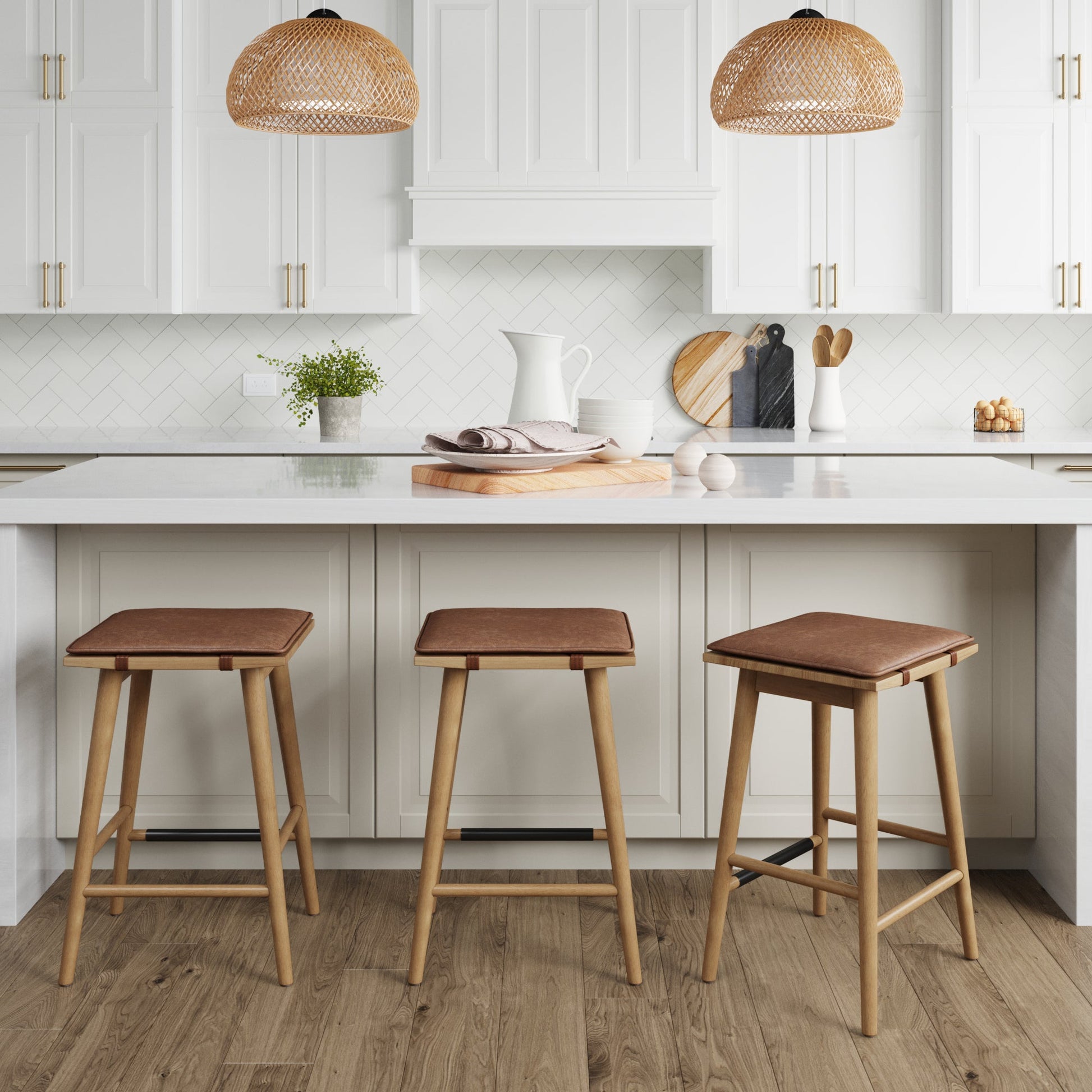Keep your kitchen guest-ready with our mixed-material Barker bar stools. Sit comfortable for hours on its removable padded saddle seat that's made of easy-to-wipe-clean faux leather and held up by solid wood legs and perfectly-placed foot rests. Plus, it features a metal frame over the footrest to avoid any scratches. Assemble these in no time at all with our easy-to-follow instructions and included hardware. At 25" tall, these refined stools are perfect for tucking under your kitchen counter when not in use. We have no doubt that this bar stool is going to be a dinner party favorite.