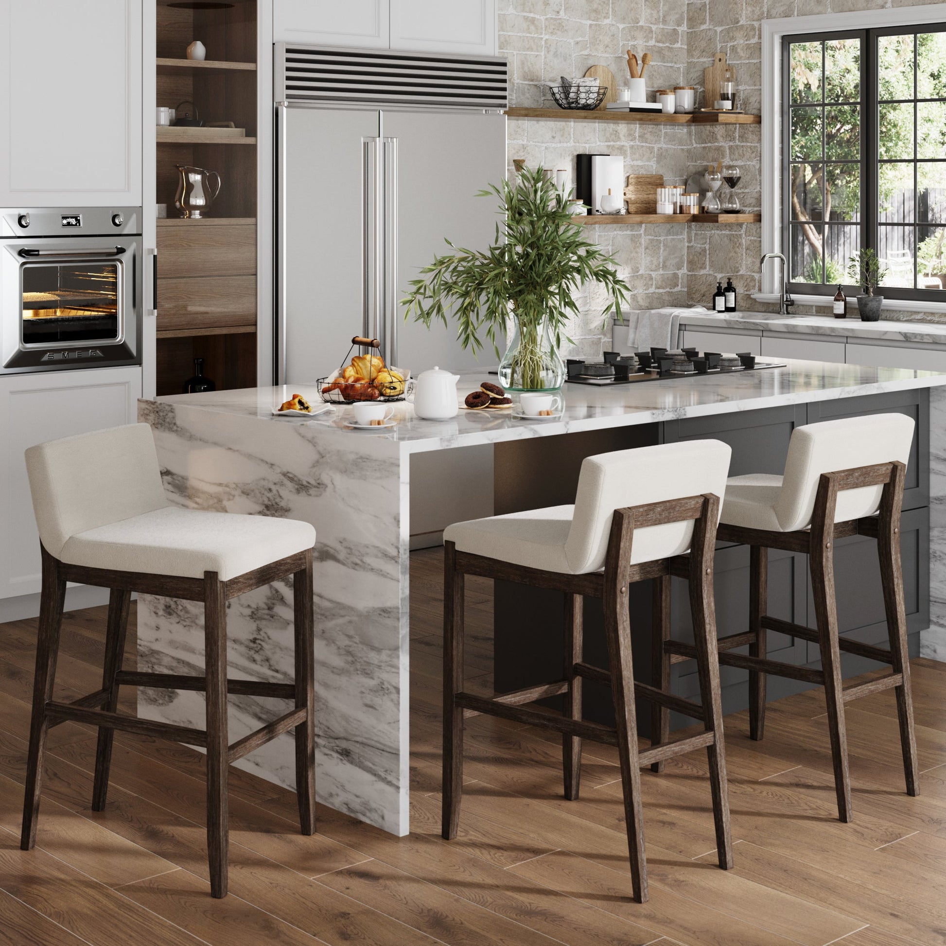 Kick your feet up in style with our Gracie bar stool. With an exposed wood back and sleek modern design, Gracie is sure to stun. Gracie combines a wire brushed dark brown wood finish and a boucle linen weave cushion for ultimate comfort and style. It boasts a modern silhouette with tapered legs and a curved seat, making this bar stool the star of any kitchen. So grab your drink of choice and sit back in full comfort on these made-to-last bar stools.