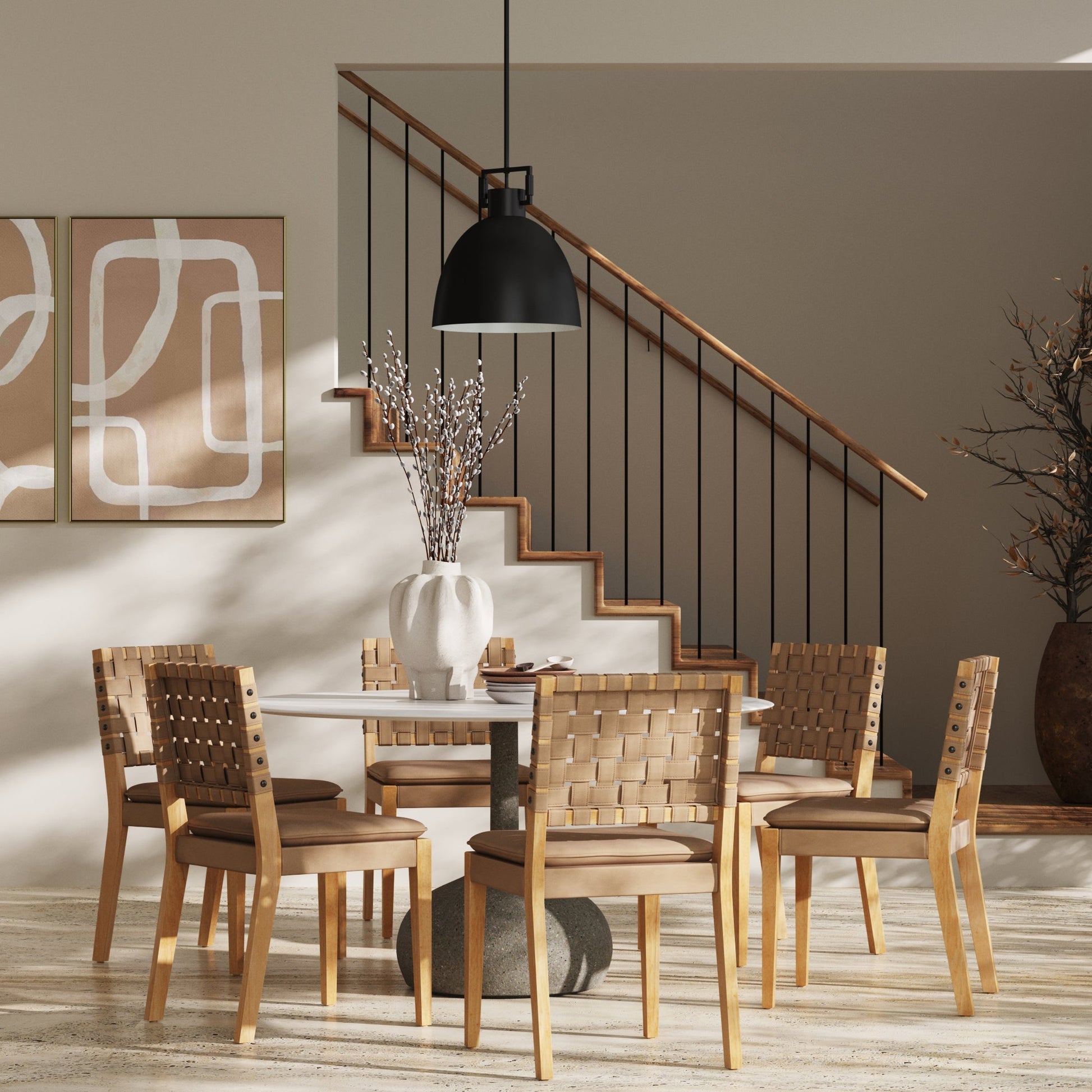 Meet Cohen, your new favorite meal spot! At a cozy 19" seat height, this dining chair fits perfectly at any dining table. Settle into its comfortably padded saddle seat while you admire the details of its hand-woven faux leather backrest. No more shifting and adjusting—our velcro-secured seat ensures you stay put, so you can relax in style. And speaking of style, Cohen's solid wood frame not only promises durability but also brings a touch of nature indoors. Pull up a seat and let Cohen make a statement in your space.