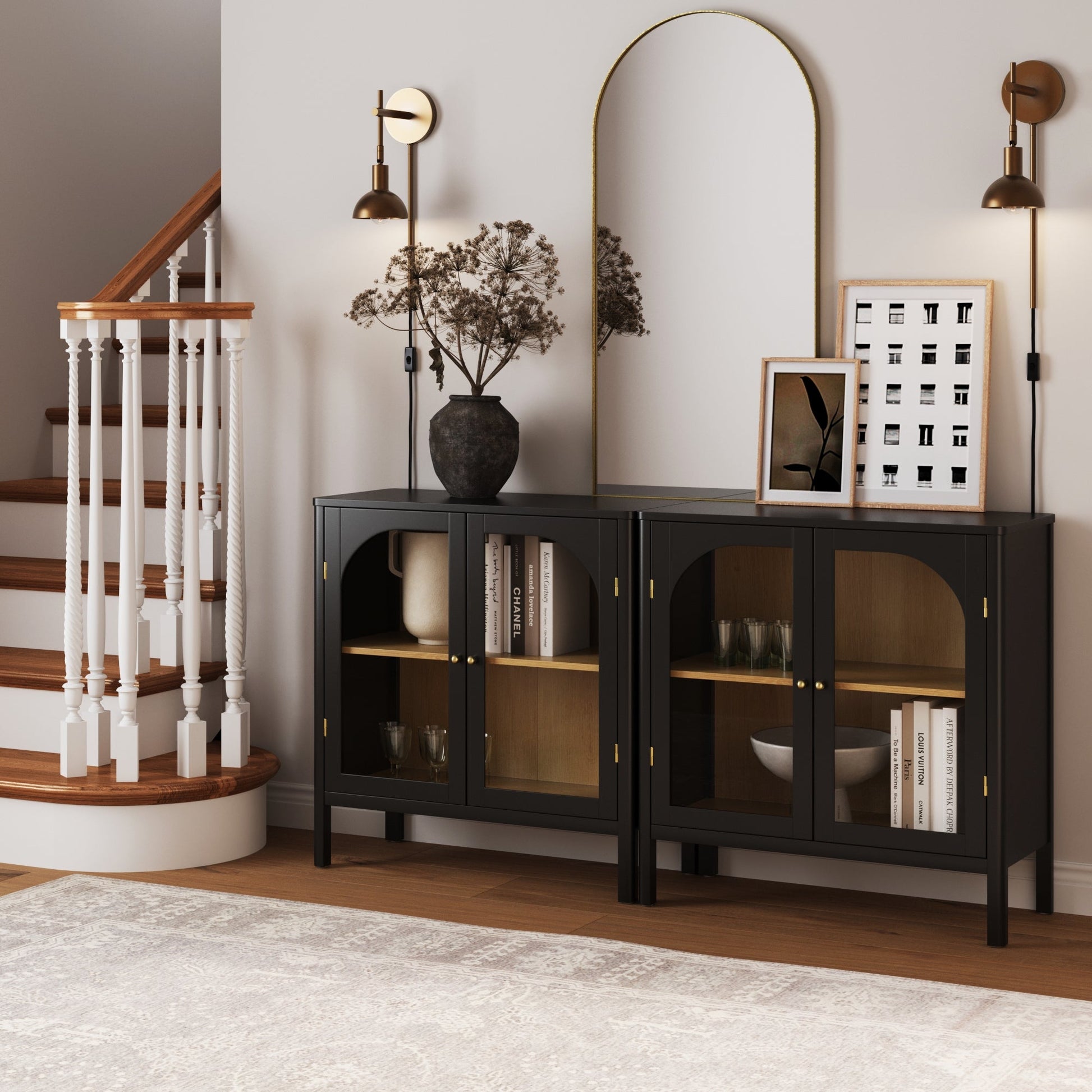 Meet Mason, the modern farmhouse storage cabinet of your dreams. Its rounded frame edge and brass finish hardware combine to create the perfect statement piece for your farmhouse-style home. The light oak finish interior and curved glass doors are the perfect backdrop to display your book collection, extra glassware, or anything else you want to show off. Place two side-by-side for double the storage and style.