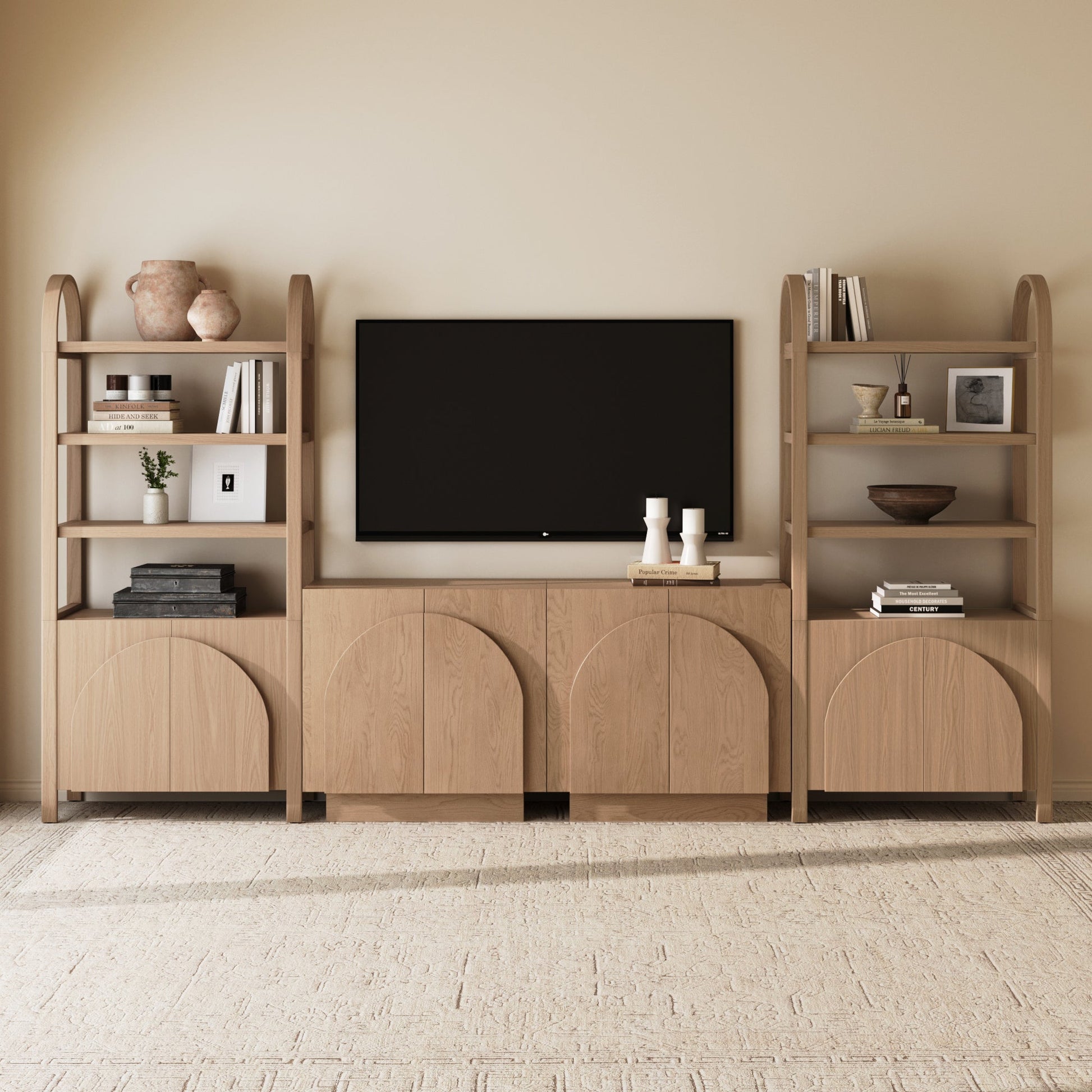 Create the perfect setting for cozy nights in with the Iris Mid-Century Modern Arched Wood Entertainment Center — a romantic blend of timeless design and modern function. With two elegant cabinets and two matching bookshelves, this beautifully crafted set frames your TV like a work of art. The gracefully arched doors add a soft, vintage charm, while the spacious storage keeps your media essentials neatly tucked away.