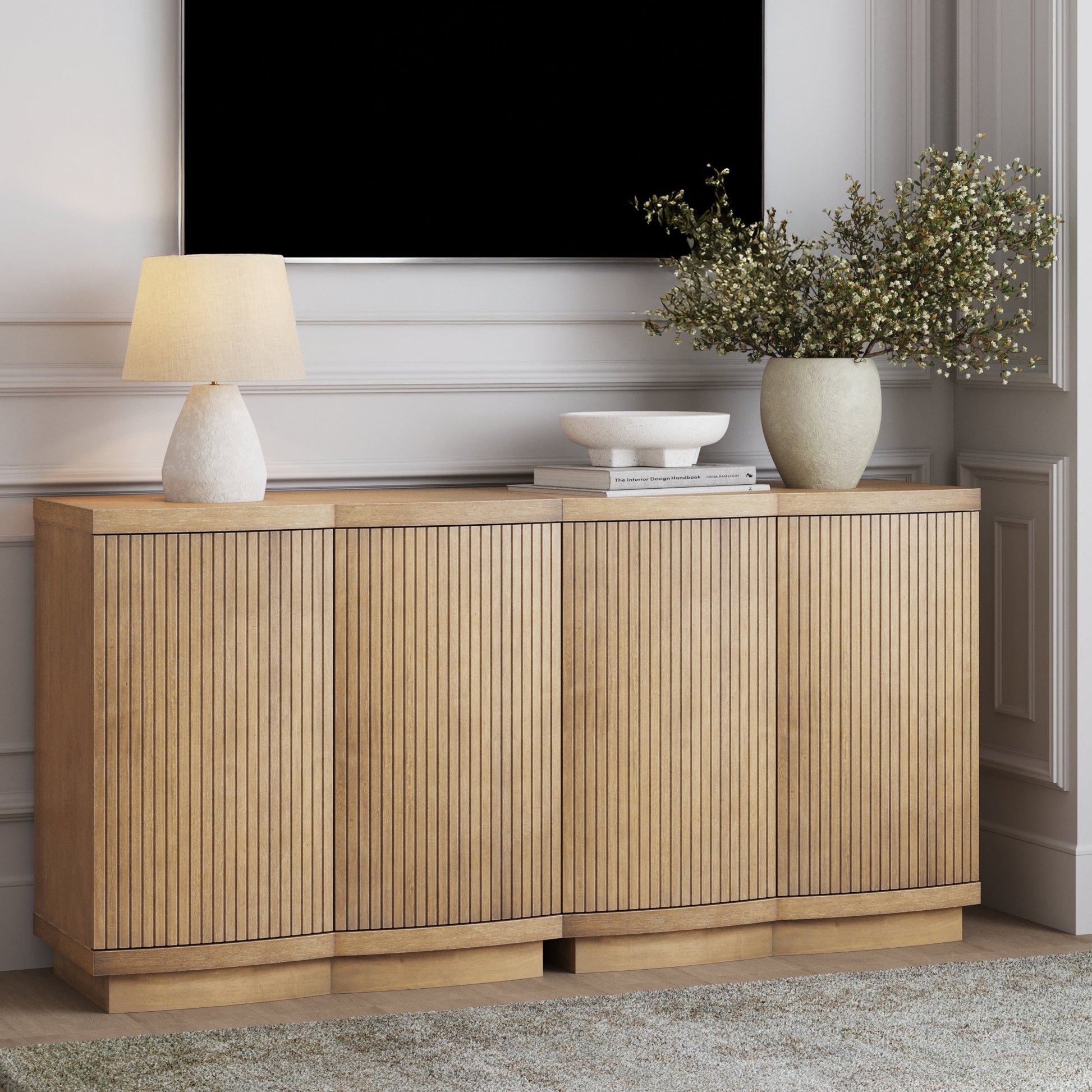 Meet the Tambellini storage cabinet—where natural beauty meets modern function. With eye-catching rectangular fluting and a warm wood finish, no two pieces are exactly alike. Line up multiple units side-by-side for a seamless, custom look, and enjoy the hidden perks like an adjustable shelf and a discreet cord management hole that keeps clutter out of sight. Stylish, practical, and perfectly imperfect—just like your space.