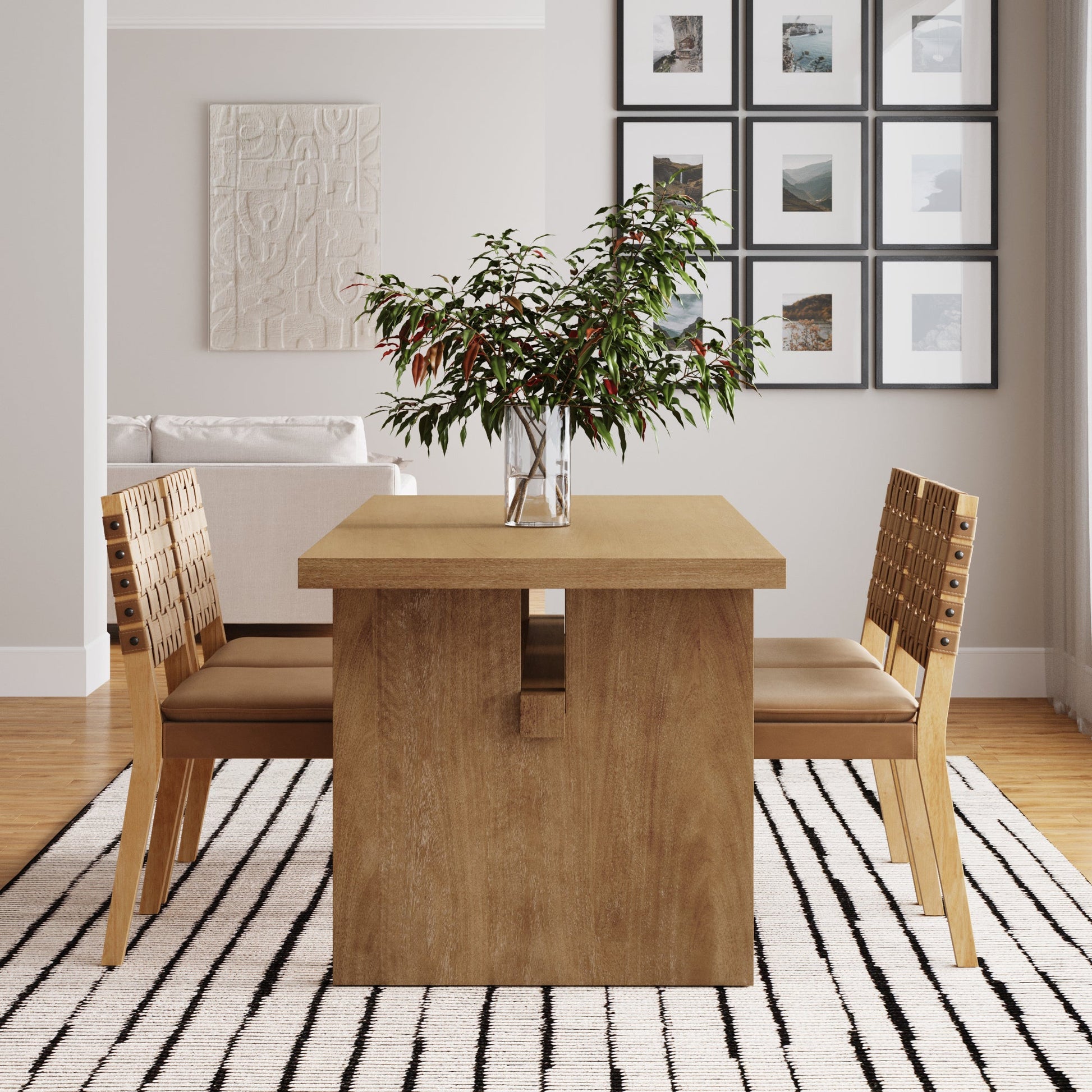 Transform your dining space with our stylish Briggs dining set, where form meets function seamlessly. The Briggs table features a durable thick-panel construction with a uniquely veneered tabletop, adding a touch of character to every meal. Paired with our Cohen chairs, you’ll enjoy the elegance of hand-woven faux leather backrests and the comfort of padded saddle seats. The 19" chair height and Velcro-secured seats keep everything in place while the solid wood frames provide lasting support. With easy assembly, this set is the perfect addition to create a chic, cozy dining area in your home. Dining set includes 1 dining table and 4 chairs.