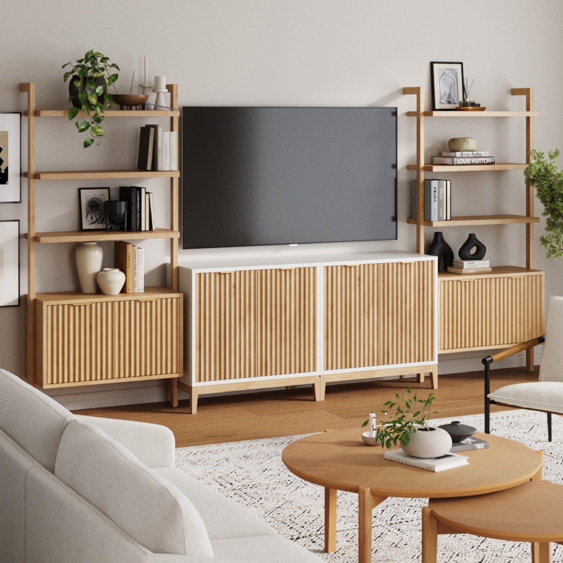 Transform your living space with the Jasper Entertainment Center, where style meets functionality! Featuring exquisite fluted door details and elegant tapered legs, this versatile piece effortlessly blends into any decor. The rich wood veneer and bright gold hardware add a touch of sophistication, while the solid wood bookshelf doors and sturdy interior supports ensure durability. When pushed together, the two storage cabinets and two bookshelves create a stunning focal point for your home entertainment setup. Plus, the secure wall mounting keeps everything safe and stable, so you can enjoy both beauty and peace of mind. Elevate your home with Jasper’s blend of charm and practicality!