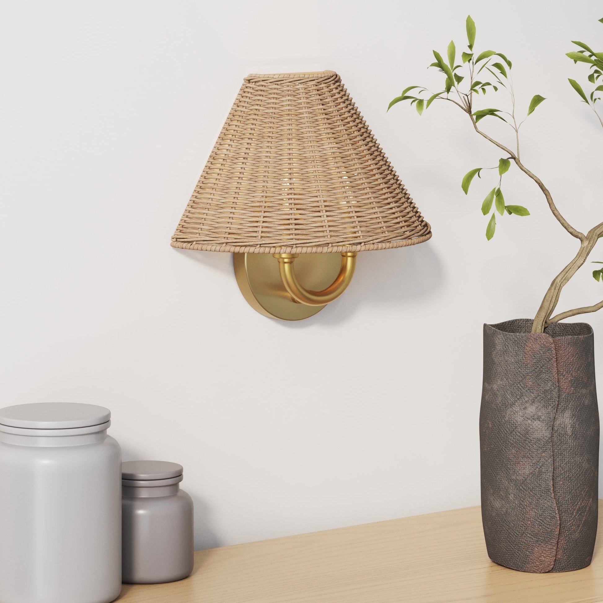 Introducing the Shoal Wall Light. With its sleek, tapered rattan shade sitting flat against the wall and a clever open back for extra illumination, this light adds a warm, welcoming glow to any space. The U-shaped socket fixture fits perfectly with two bulbs, giving you just the right amount of brightness. Plus, it's hardwired for a polished look and rated for dry locations.