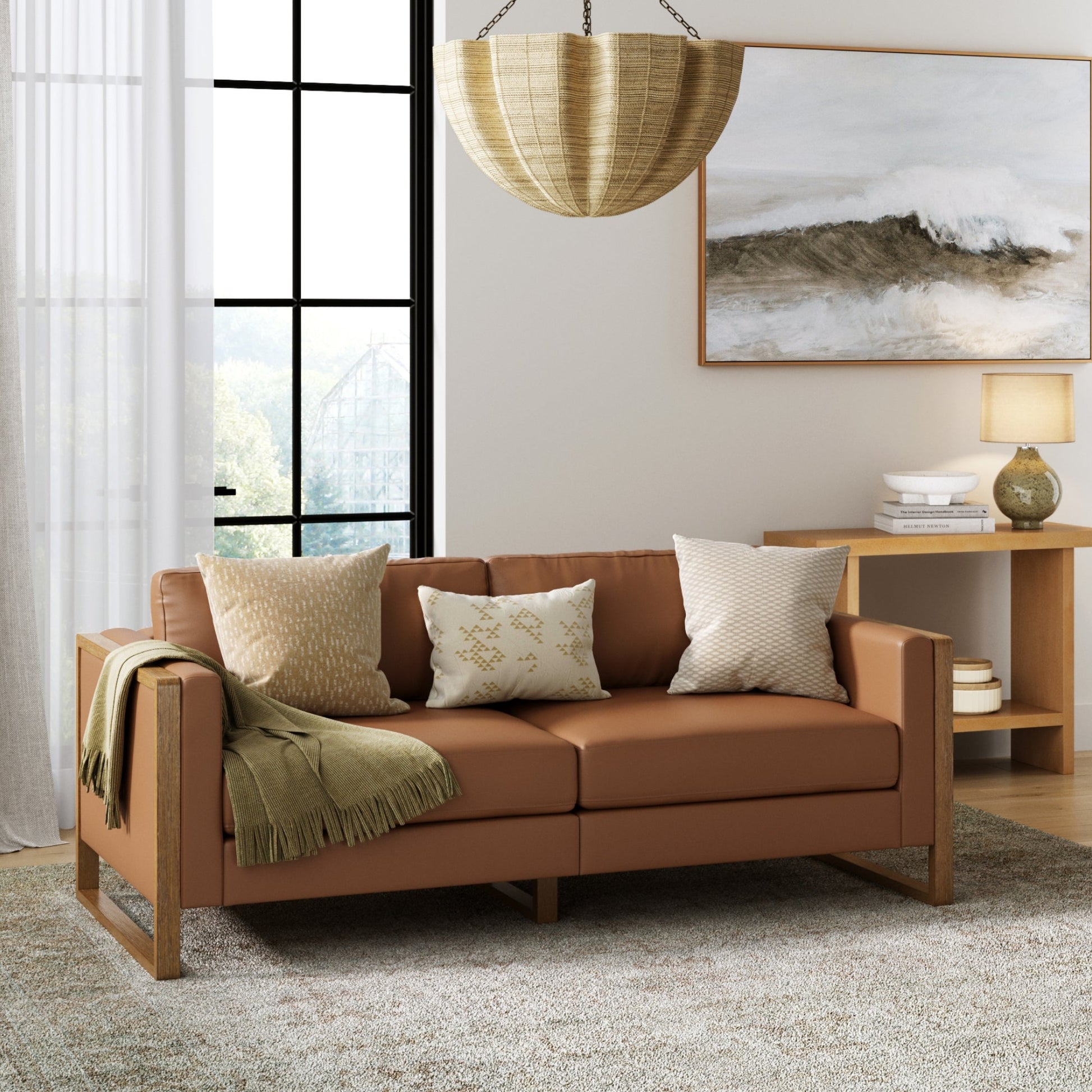 Leather Wood Frame Loveseat Sofa Couch Camel