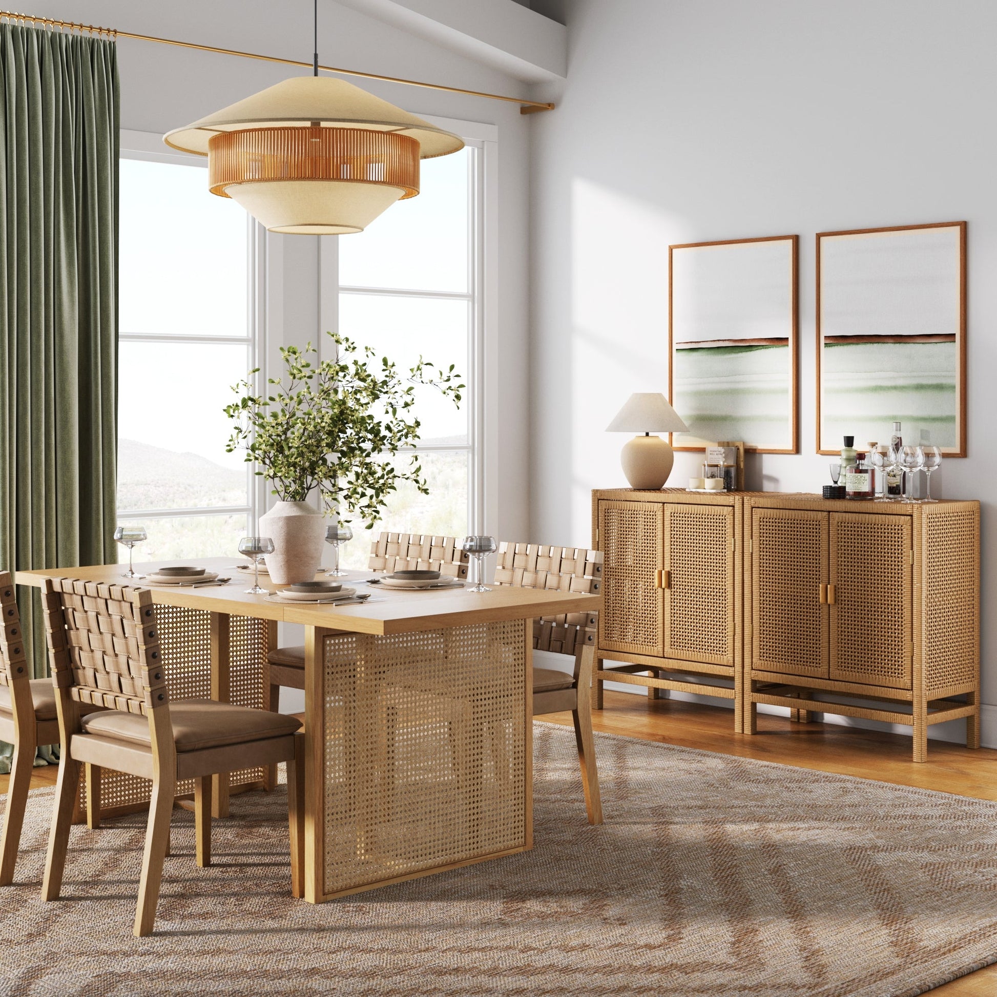 Add a touch of bohemian charm to your space with the Tanner Storage Cabinet, where function meets style. Crafted with a solid wood frame and wrapped in elegant synthetic rattan, this piece offers both durability and a breezy, open weave design. The light golden oak finish adds warmth, making it a perfect match for your relaxed, cozy vibes. Inside, an interior shelf provides the perfect spot to tuck away your treasures, keeping your space both chic and clutter-free.