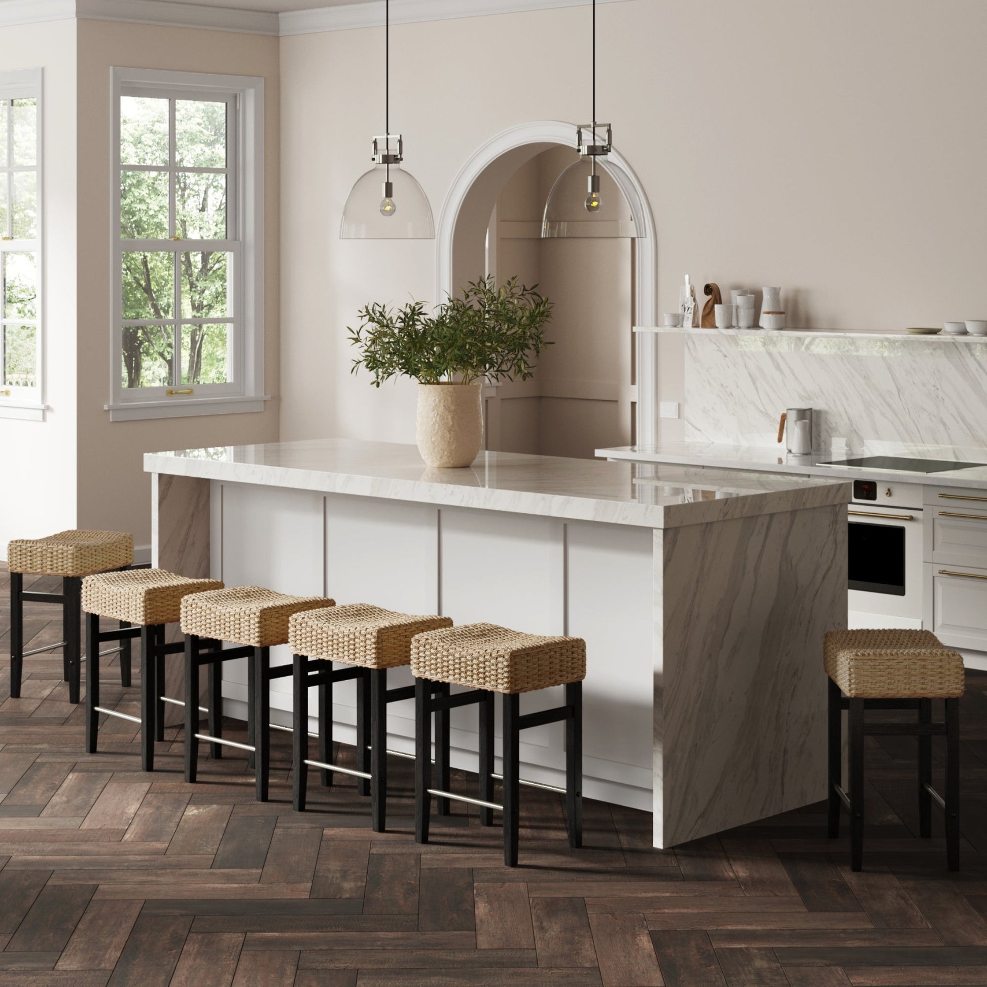 Crafted with a saddle seat shape, the Harvey Bar Stool ensures maximum comfort for extended seating, making it perfect for leisurely meals or casual gatherings. Whether you're enjoying a quick morning coffee or hosting a dinner party, the Harvey Bar Stool will elevate your seating experience with its style and comfort. It features a woven seagrass seat that brings a natural and earthy vibe to your space, while its black legs with a wire-brushed finish add a touch of modern fun. Plus, the chrome stretcher footrests make the stool sturdy and long-lasting. Bon appétit!