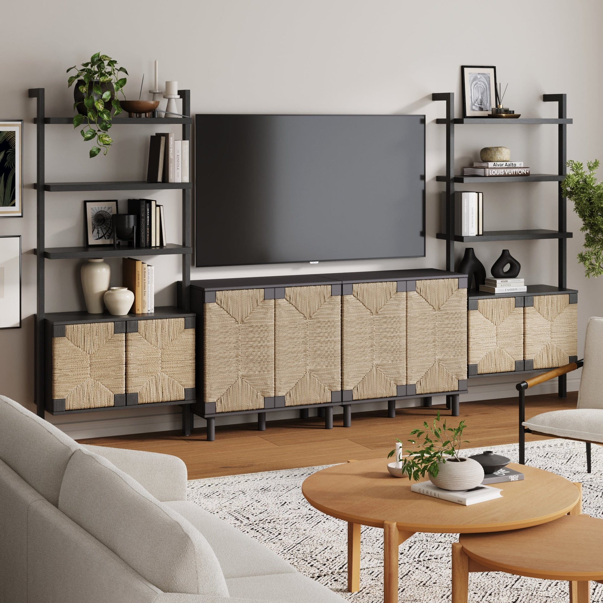 Transform your living space with the Beacon TV wall unit, a harmonious blend of style and function. This unit features two Beacon storage cabinets and two Beacon bookshelves, each boasting natural seagrass doors that add a touch of organic elegance. The real wood veneer finish and solid wood legs underscore the unit's robust construction and timeless appeal. The storage cabinets are designed with push-latch doors for a seamless look and adjustable shelves to accommodate all your essentials, while the exposed shelves on the bookcases are fixed to offer sturdy display options. Each bookshelf is designed to secure to the wall, enhancing safety by preventing any tipping hazards. As each piece is crafted from natural wood, expect a delightful variety of color and texture that makes every unit uniquely yours. The Beacon TV wall unit not only organizes your space but also enhances it with its sophisticated, earthy aesthetic.