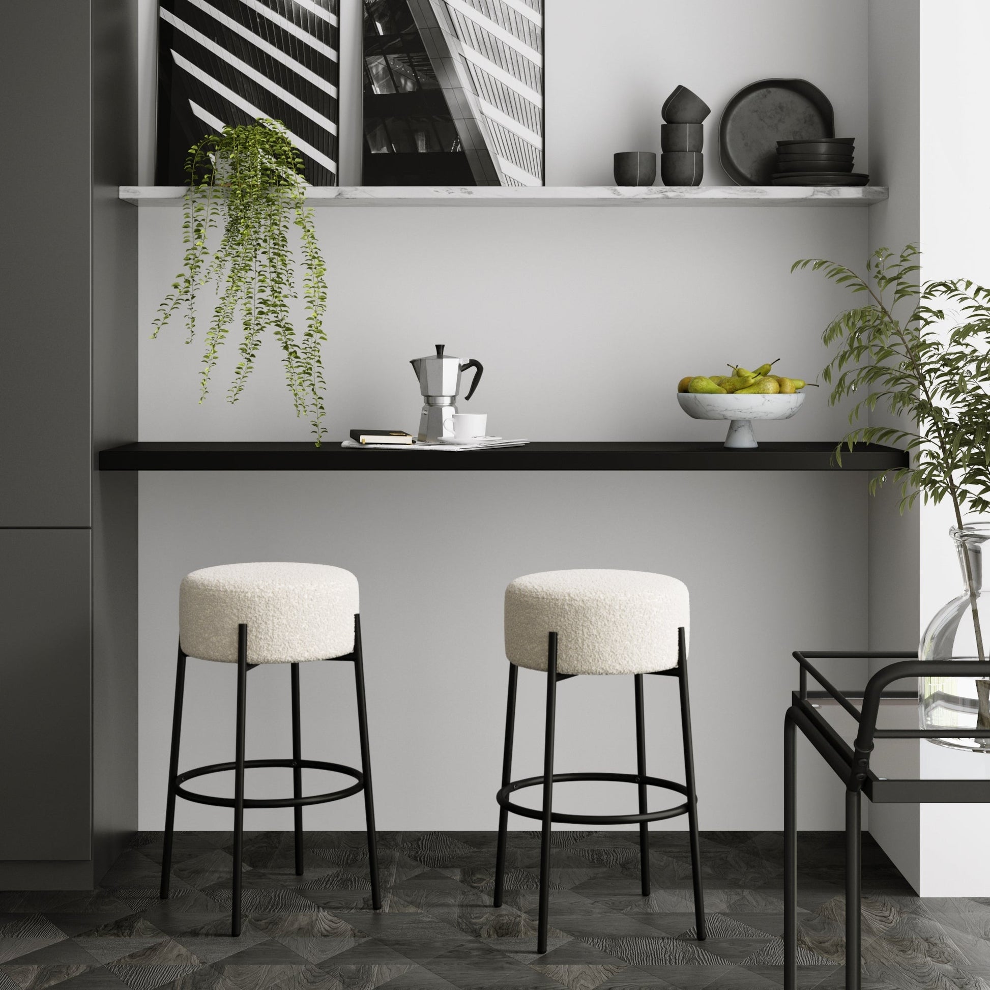 Looking for the perfect white bar stool? Meet Isaac, the bar height set of 2 backless bar stools you’ll never want to get up from. With a soft padded seat covered in our gorgeous white boucle fabric, Isaac is the perfect combination of form and function. This metal bar stool has a built in footrest that keeps your legs comfortable as you sip on that end-of-day rosé. Its 29” height means it will fit perfectly at your bar or as your kitchen island stools. And with a 15-minute assembly time per stool, your kitchen will gorgeous in no time, with almost no effort! We love that for you.