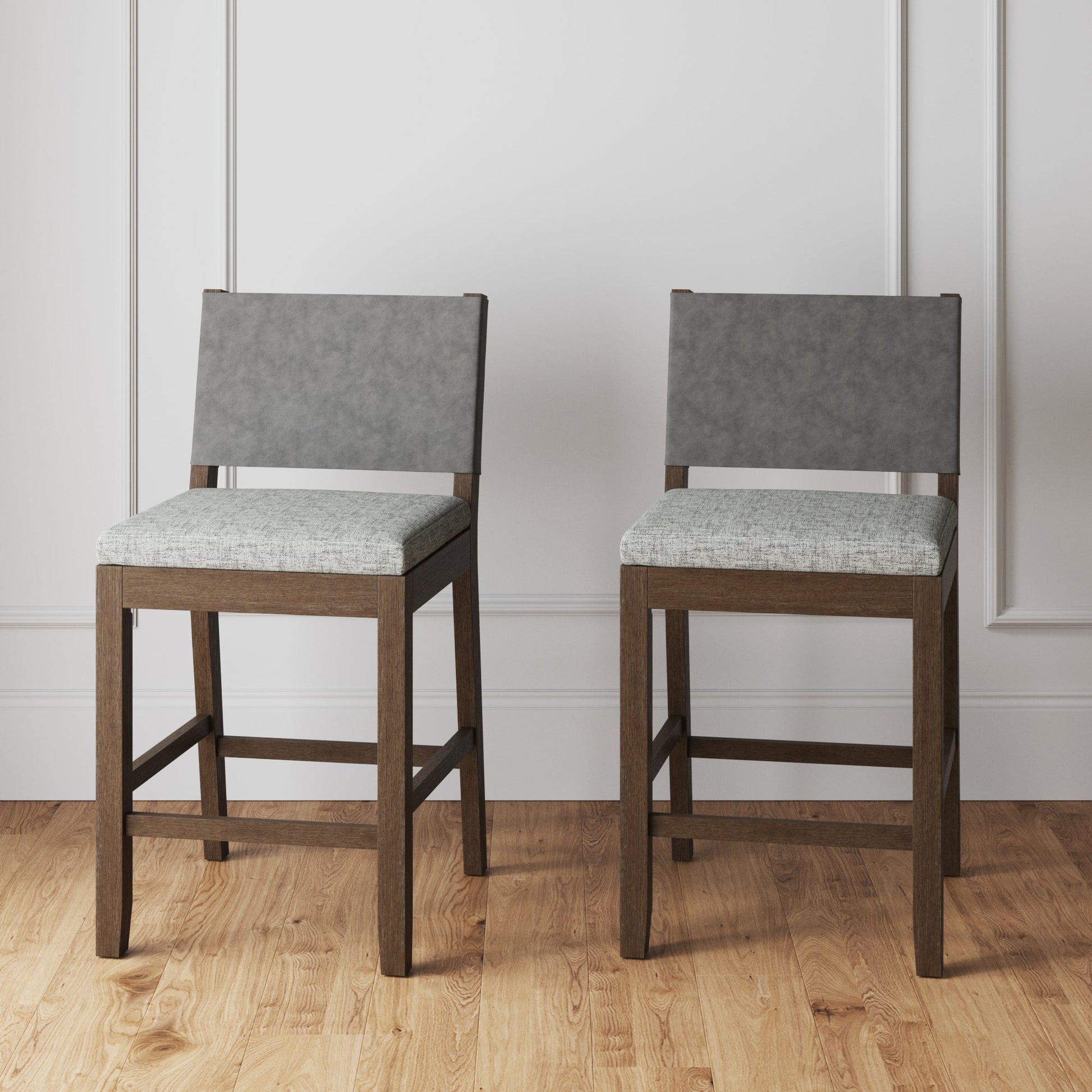 We loved our Linus Bar Stool so much, we had to make it in another color combination. Our Linus bar stool features a thick, durable cushion covered in grey birch ivory material paired with contrasting rubber wood legs in a brushed dark brown wash. Linus adds comfort and style to any kitchen with its clean modern lines and faux leather seat back in a beautiful pewter grey finish. It has a built-in footrest so you can enjoy each meal in complete comfort. This timeless bar stool will seamlessly blend in with your modern farmhouse home and the best part: it takes only 15 minutes to assemble!