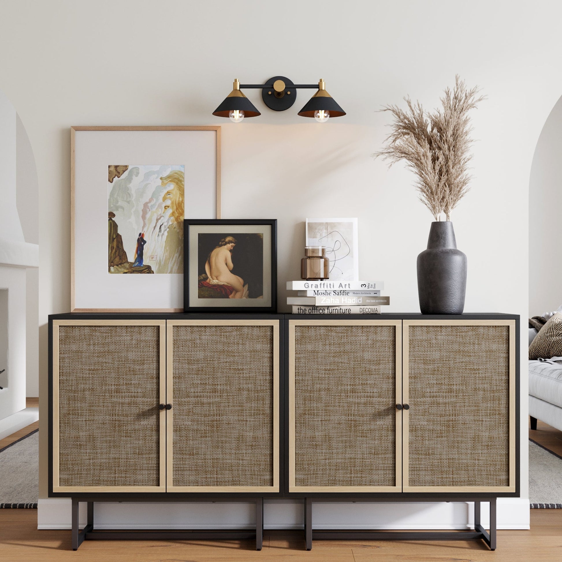 We’ve got all the heart eyes for Kova! Kova features two natural rattan doors contrasted with a black oak wood frame and handles for an organic texture that balances the sleek profile. This set of 2 cabinets effortlessly blends beauty with functionality. Use them in your entryway to greet guests, in the living room to display your record player, or as an elegant addition to a dining room. Open the front cabinets to reveal two internal shelves that are adjustable and will help keep any room looking organized!