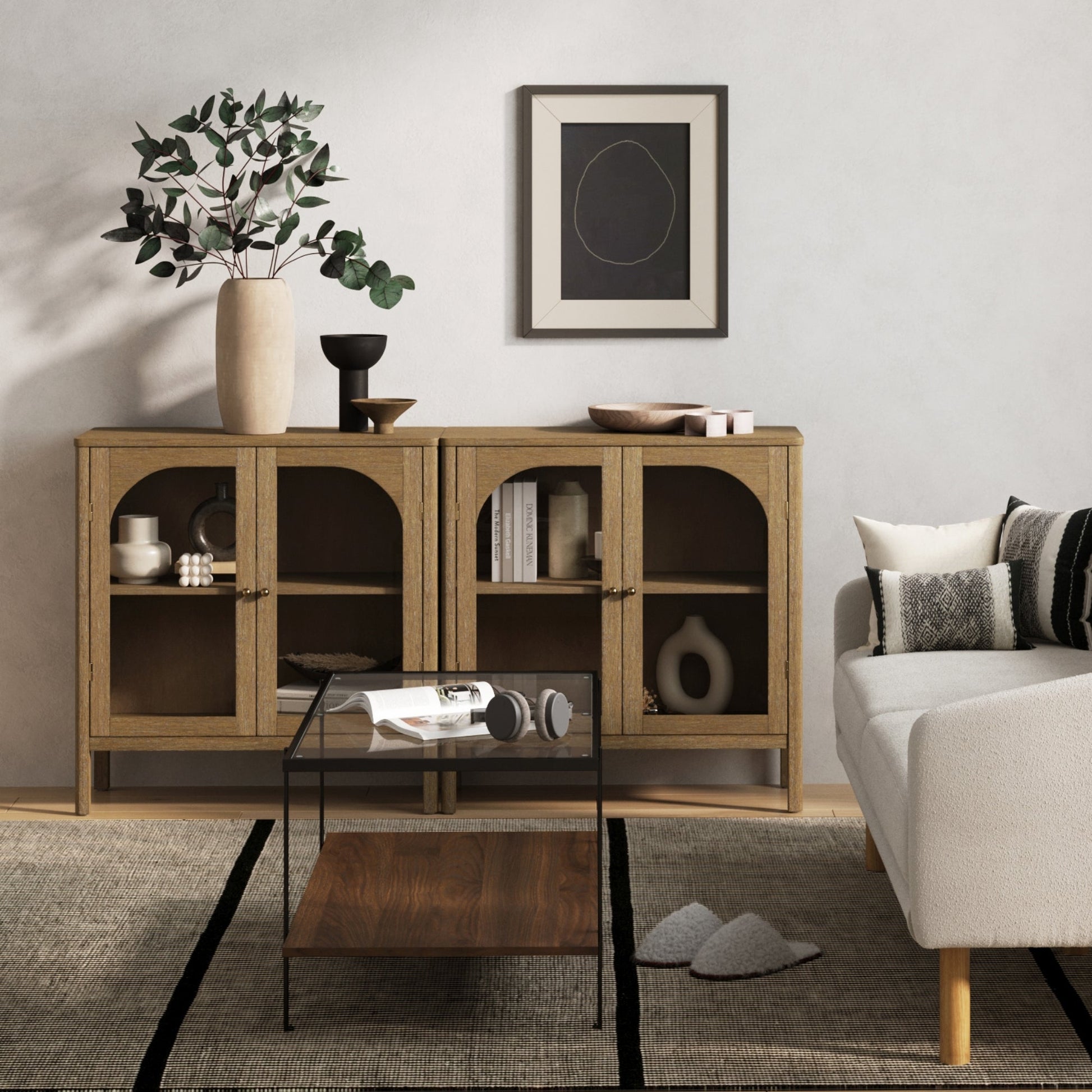 Meet Mason, the modern farmhouse storage cabinet of your dreams. Its rounded frame edge and brass finish hardware combine to create the perfect statement piece for your farmhouse-style home. And let's not forget that wire brushed light brown interior – it's like the warm hug your belongings have been waiting for. Those curved glass doors? They're practically saying, "Put your books, fancy glassware, or your collection of quirky gnome figurines on display here!" Oh, and here's a pro tip: Double the storage and style by placing two of these beauties side by side.