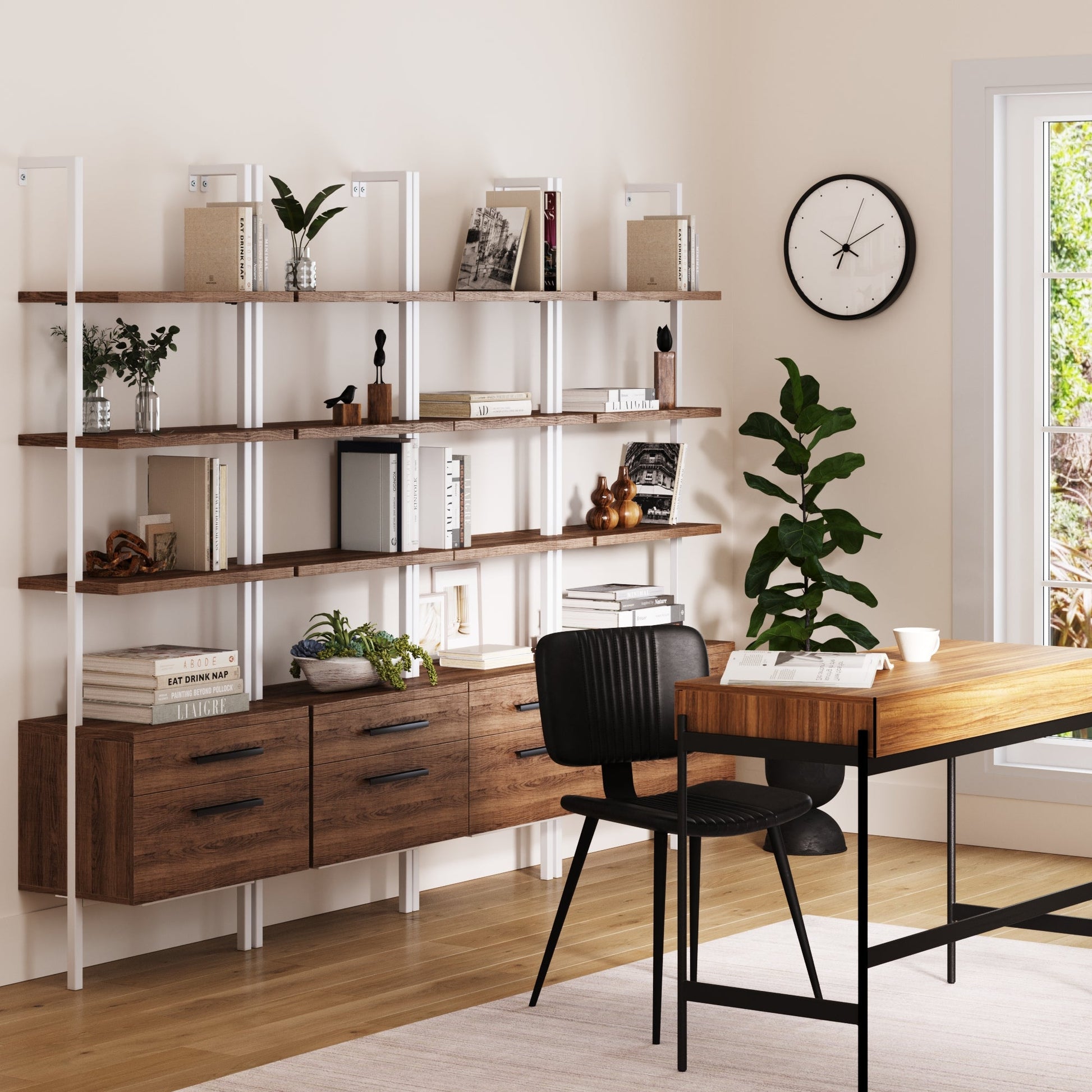 Bring your storage game to a new level. Starting from top to bottom, the Theo storage bookcase provides a minimalist open-design style with a strong frame, durable particle board shelves, and easy to glide drawers to tuck away everything from books to those wires you've been holding onto just because. Theo was designed for optimizing storage and display potential, it will help keep your home clutter-free and be your space-saving solution while displaying all of your collectibles.