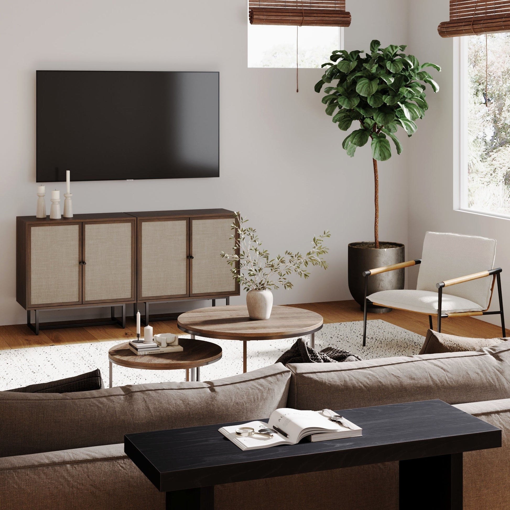 We’ve got all the heart eyes for Kova! Kova features two durable synthetic rattan cabinets contrasted with a walnut finish frame and matte black handles for an organic texture that balances the sleek profile. This cabinet effortlessly blends beauty with functionality. Use it in your entryway to greet guests, in the living room to display your record player, or as an elegant addition to a dining room. Open the front cabinets to reveal two internal shelves that are adjustable and will help keep any room looking organized!