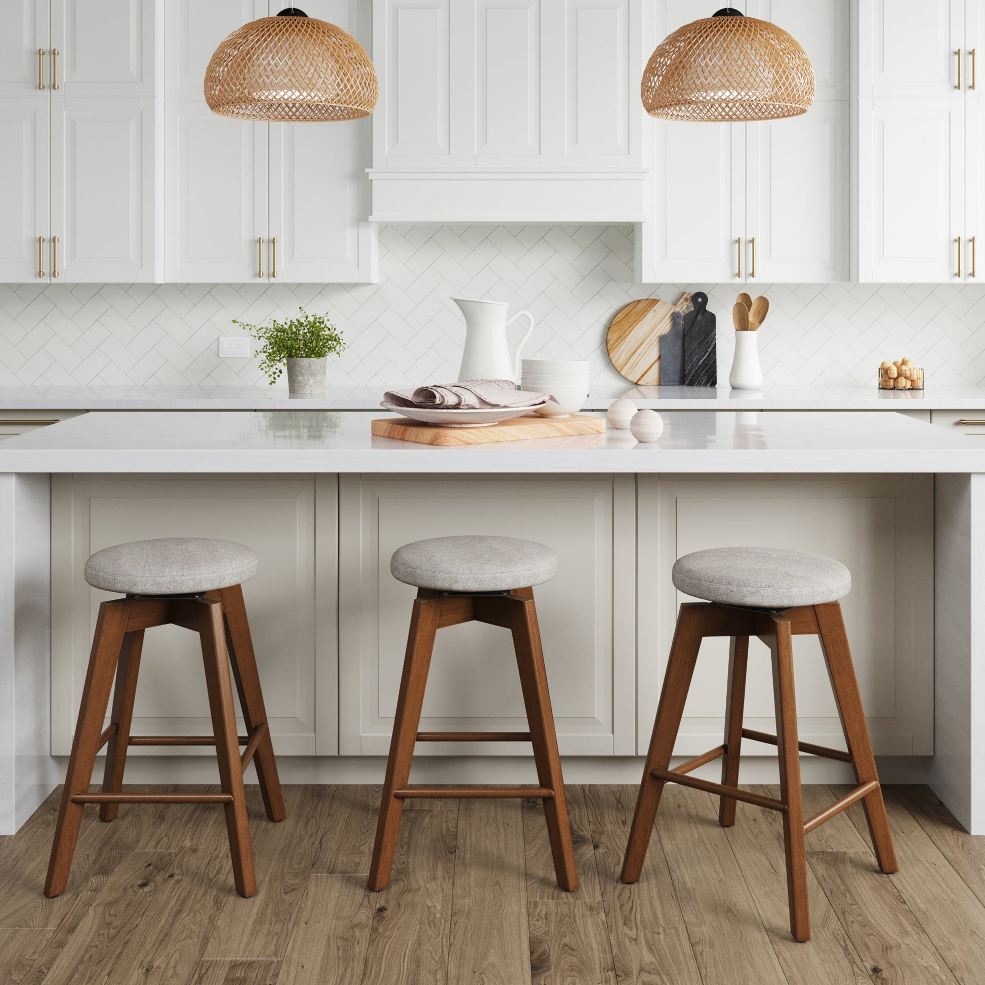 Turn your day around. The Amalia solid wood stools work beautifully at the bar, counter or tall table. A strategically placed wooden bar to rest your feet and a comfortable padded seat makes this classic design one that you will love for a very long time. Amalia features a 360 swivel seat, so no one feels left out during the convo. These stools were designed with easy assembly in mind and neutral design to work with any room, with a natural wheat color fabric and warm antique coffee wood base.